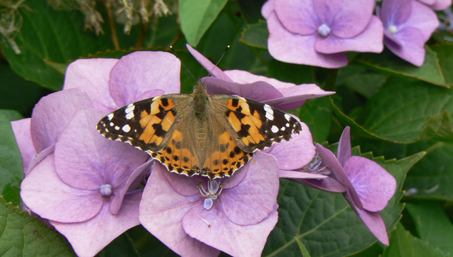 Schmetterlinge lassen sich durch den Sommerflieder in den Garten zaubern. Hier sonnt der Schmetterling auf einer Hortensienblüte.