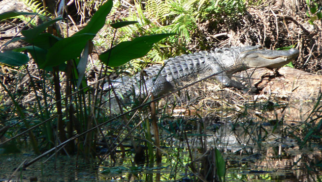 Ein Alligator ist in unserer Heimat nicht verbreitet. Doch aus den Sümpfen Floridas verirrt sich manchmal ein Exemplar in den Hausgarten einer ganz normalen Familie. (Dieses Exemplar nahm nach dem Fotoshooting ein kühles entspanntes Bad.)