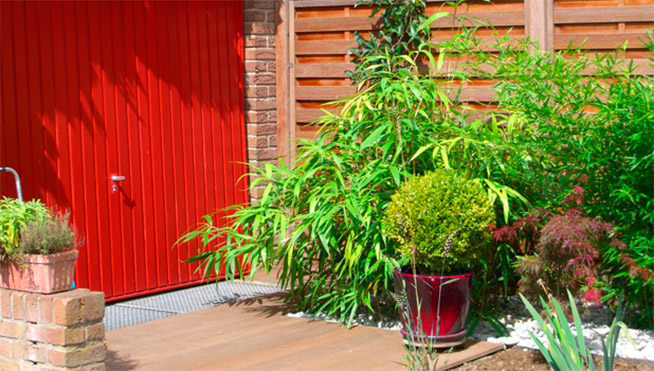 Das Garagentor verliert seine graue Farbe. Es erwacht in einem satten Rot und wird Anziehungspunkt einer früheren tristen Ecke des Gartens.