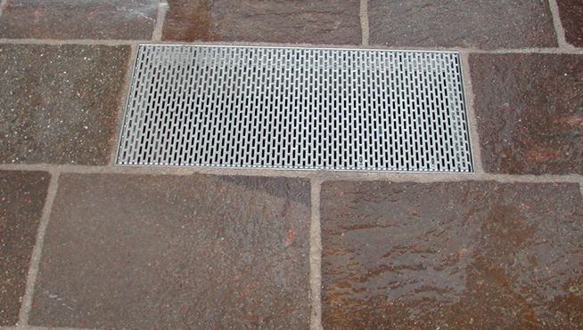 Eine kleine Schachtabdeckung in der Grösse der Porpyrplatten.