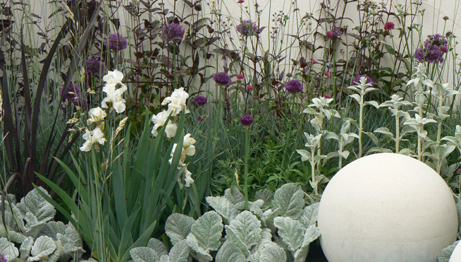 Staudenbeet mit Gräsern und Iris.Der Akkzent liegt hier im lilafarbenen Bereich der hinübergeht in eine weiß graue Bepflanzung.