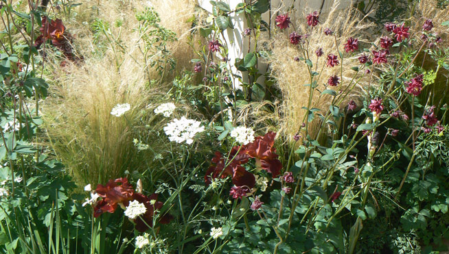 Staudenbeet mit Gräsern und Iris, Akelei und weißer Schafgarbe. Ein bezaubernde Bild.