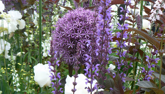 Staudenbeet in weiß und blau. Allium wird hier umschmeichelt von dem Bartfaden Pfingstrosen und Salvien.