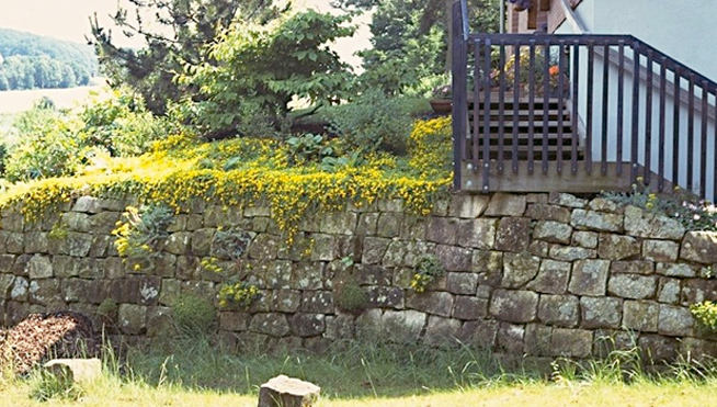 Eine Trockenmauer aus Steinbrüchen am Ith, als Hangbefestigung mit der richtigen Neigung und Entwässerung hält Sie Jahrzehnte und ist zahlreichen Pflanzen und Tieren zugleich Heimat. Häufig finden sich an solchen Orten die auf der roten Liste stehenden Salamander. Aber alle möglichen anderen Tiere nutzen die Spalten und die abgebende Wärme solcher Trockenmauern.