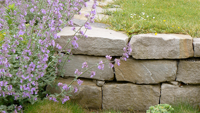 Eine niedrige Trockenmauer aufgesetzt aus Ruhr-Sandstein. Hier finden sich je nach Bruch braune bis graue Töne. Die lilafarbene Katzenmintze schmiegt sich an den Stein. Eine perfekte Verbindung.