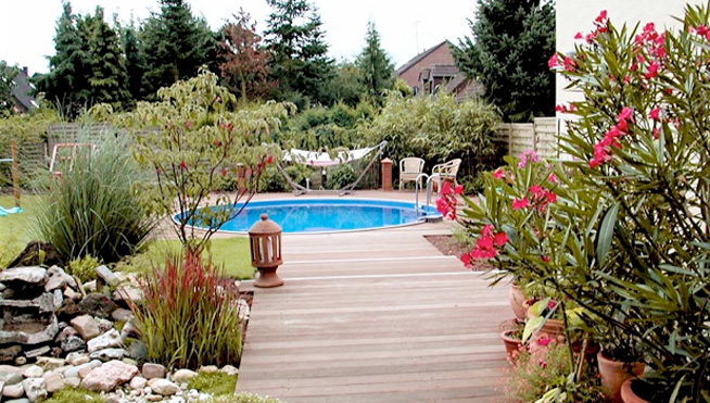 Ein runder Pool in eine Terrassenlandschaft aus Holz integriert. Die Wassertemperatur kann durch Solaranlagen in der Übergangszeit deutlich erhöht werden, so dass man sich viel länger im kühlen Nass tummeln kann.