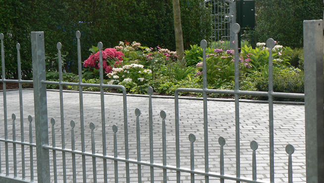 Das Tor der Garagenzufahrt, die Eingangstür und der niedrige nur ca. 80cm hohe Zaun zur Nachbarschaft ist gleich gestaltet. Verzinktes Stahl in ungewöhnlichem Design.